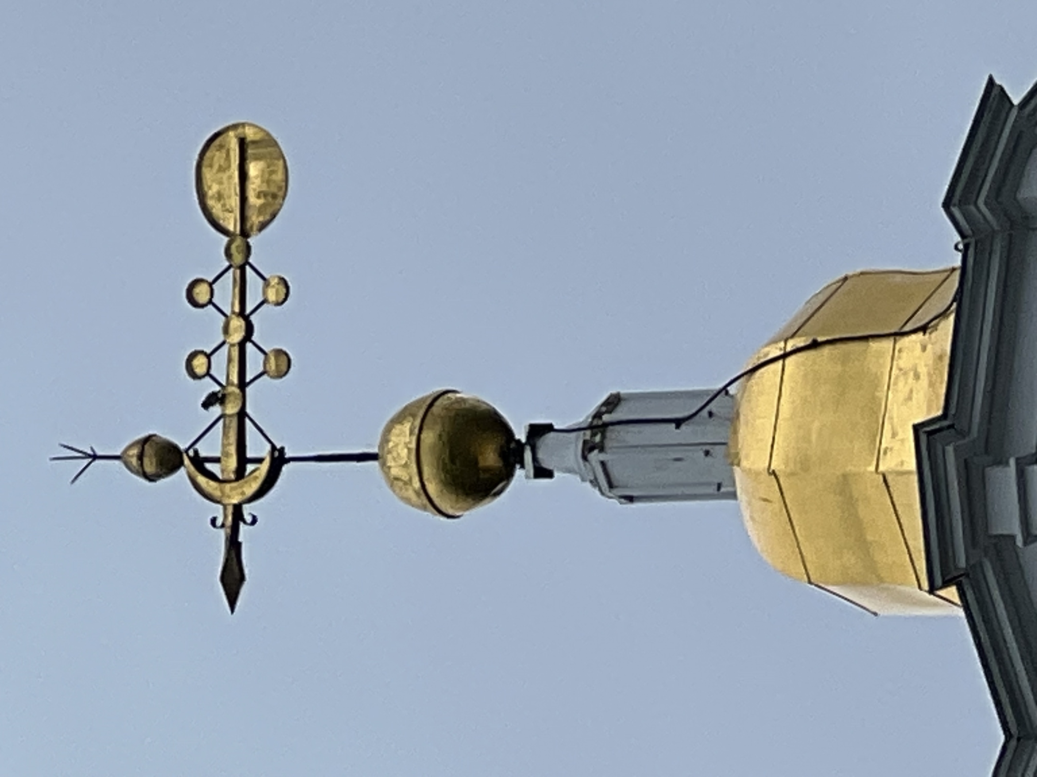 Adorned atop the steeple of the church is a weathervane manufactured by local blacksmith Nathan Kendall, his crowbar serving as its central axis. It represents the sun, moon, and seven stars as a remembrance for the congregation, urging them to "Remember the Sabbath Day, to keep it holy. Six days you shall labor and do all your work, but the seventh day is a Sabbath to the Lord your God." Exodus 20:8-12
