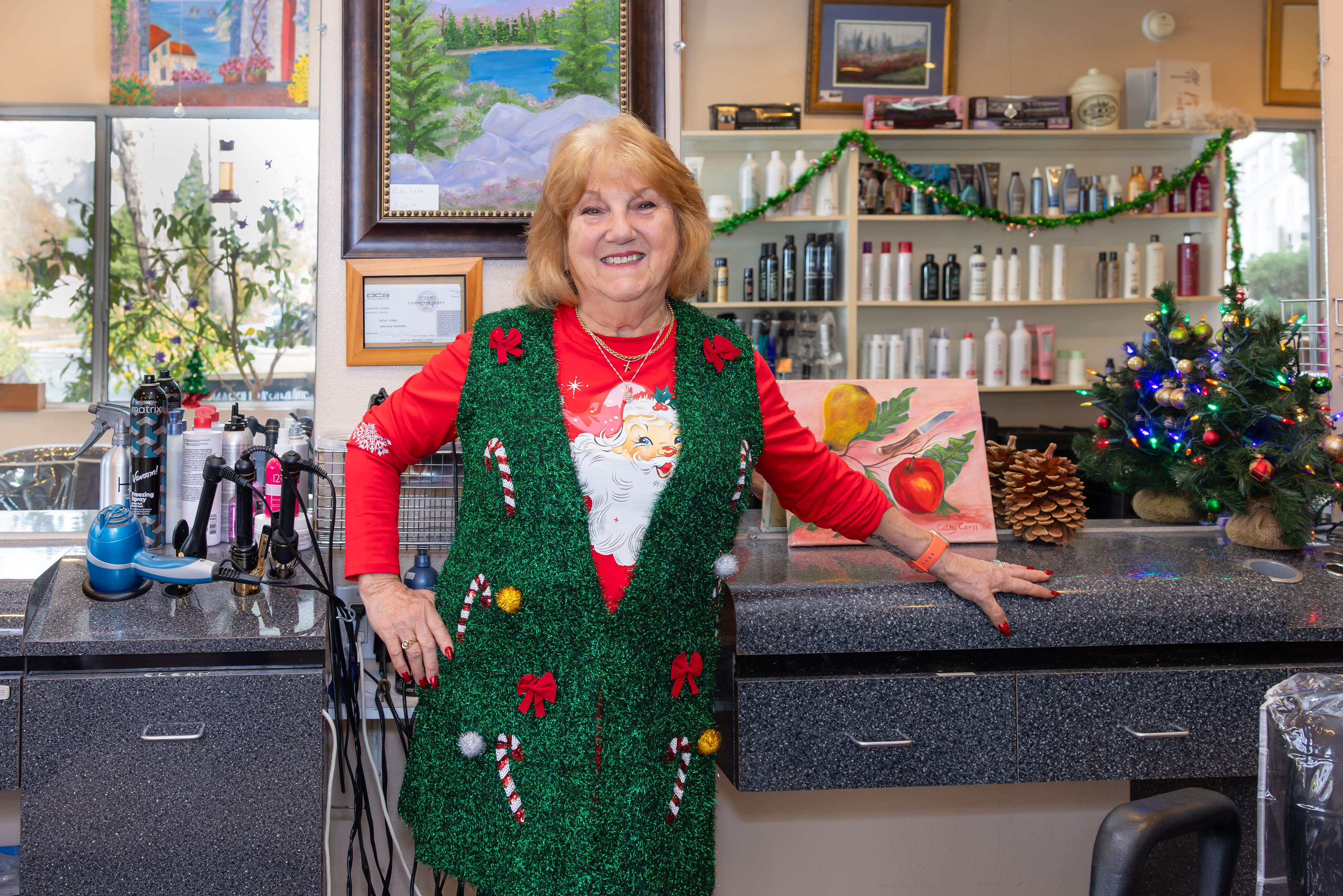 Cathy's talents and contributions don't end at owning a business, doing hair and being a wonderful matriarch. She also started painting 25 years ago with her best friend Joann. They get inspired on Tahoe trips, which is where the family recreates away from the shop. Cathy's many paintings can be seen (some for sale) on the walls of Sisi's.